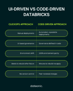 | Feature | The „ClickOps” Approach | The Dateonic Way (Terraform + DABs) |