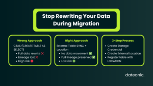 The most destructive anti-pattern we encounter: teams migrating Hive metastore external tables to Unity Catalog via CTAS, inadvertently converting them to managed tables and triggering full data rewrites into the managed storage path.