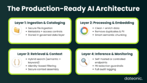 A production-ready architecture for running AI on internal data securely consists of four discrete, tightly governed layers.