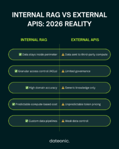 The architectural decision between internal RAG and public APIs is no longer a debate about model capabilities – it is a strategic mandate on data architecture, pipeline quality, and operational ownership. While external APIs offer rapid prototyping, they expose regulated enterprises to unacceptable compliance risks and fail to deliver the granular data control required for true business value.