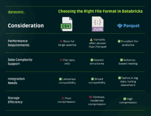 Selecting the right file format in Databricks depends on factors like query performance, data structure, compatibility, and storage efficiency. To help you quickly compare these trade-offs across CSV, JSON, and Parquet, I’ve summarized the differences in the following infographic: