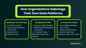 Many data teams still rely on UI-driven imports and exports, or basic Repos integrations that lack a strict, automated CI/CD pipeline. In these scenarios, Databricks is treated more like an isolated playground than a tier-one engineering environment. Code is modified on the fly in production workspaces to „fix” bugs, completely bypassing source control and destroying any audit trail.